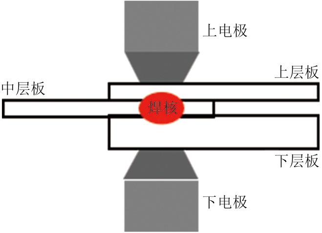用線切割方法在鋁合金板上截取長度為100 mm、寬度為30 mm的全厚度試樣,長度方向為軋制方向。將試樣在長度方向進行搭接裝配,搭接長度均為30 mm,上層板和中層板厚度為2 mm,下層板厚度為4 mm。用砂紙打磨搭接區(qū)域至顯示金屬光澤,再用丙酮去除表面油漬,采用東升300型三相整流電阻點焊機進行焊接試驗,焊接壓力為1.9 kN,預壓時間為0.010 8 s,焊接時間為0.012 8 s,維持時間為0.016 s,休止時間為0.01 s,焊接電流分別為15,17,19,21 kA。圖2為鋁合金不等厚三層板電阻點焊示意。