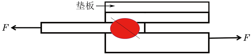 焊接完成后,采用線切割機在焊核區(qū)截取金相試樣,用砂紙研磨,拋光至鏡面,用水沖洗表面雜質(zhì),再用凱勒試劑(95 mL水+2.5 mL HNO3+1.5 mL HCl+1.0 mL HF)腐蝕,采用EPIPHOT 300U型倒置光學顯微鏡觀察拋光態(tài)形貌和顯微組織,計算熔透率。采用CMT-5015型萬能試驗機進行拉伸試驗(如圖3所示),拉伸速度為5 mm·s−1,為了避免接頭在拉剪過程中產(chǎn)生扭矩,采用同等板厚的材料作為墊板,使試樣上下厚度相同。采用FM-700型維氏硬度計進行接頭硬度測試,施加的載荷為1.96 N,保載時間為10 s,測試點位置如圖3所示,從上層板母材位置開始,經(jīng)過焊核區(qū)直至下層板的母材為止進行測試,測距為6 mm。上述試驗均測3個平行試樣,取平均值。