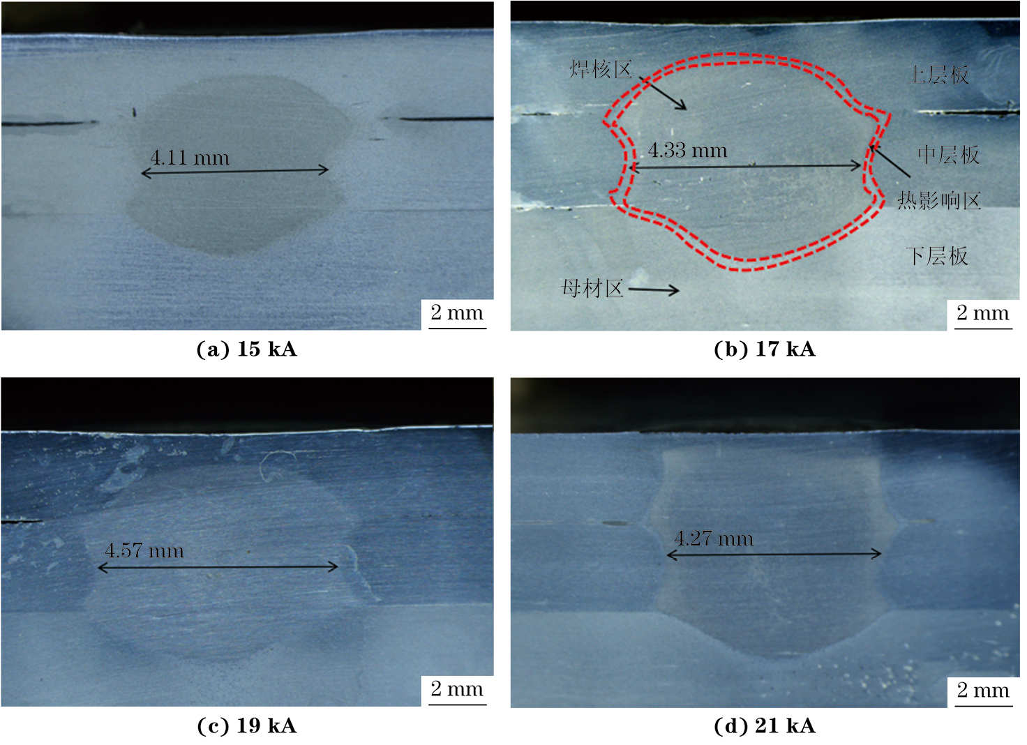 由圖4可以看出,不同焊接電流下接頭均由母材、焊核區(qū)和熱影響區(qū)組成,未發(fā)現(xiàn)氣孔、裂紋、孔洞等宏觀缺陷,為無缺陷接頭。當焊接電流為15~19 kA時,焊核呈馬蹄形,與文獻[12]的試驗結果一致,在該電流范圍隨著焊接電流增大,焊核直徑增大,上層板熔透率增大;當焊接電流增加至21 kA時,焊核形狀轉(zhuǎn)變?yōu)檠男?,焊核直徑小于焊接電?7,19 kA時,上層板基本熔透,熔透率顯著增加。電阻點焊時的熱輸入為被焊材料的電阻熱,板與板界面處的接觸電阻最大,產(chǎn)熱最多,熔化直徑大于中層板和上、下層板,因此形成馬蹄形焊核,但當焊接電流增至21 kA時,上層板基本熔透,熱量沿上層板的長度方向散失,導致焊核呈腰鼓狀,同時焊核直徑減小。