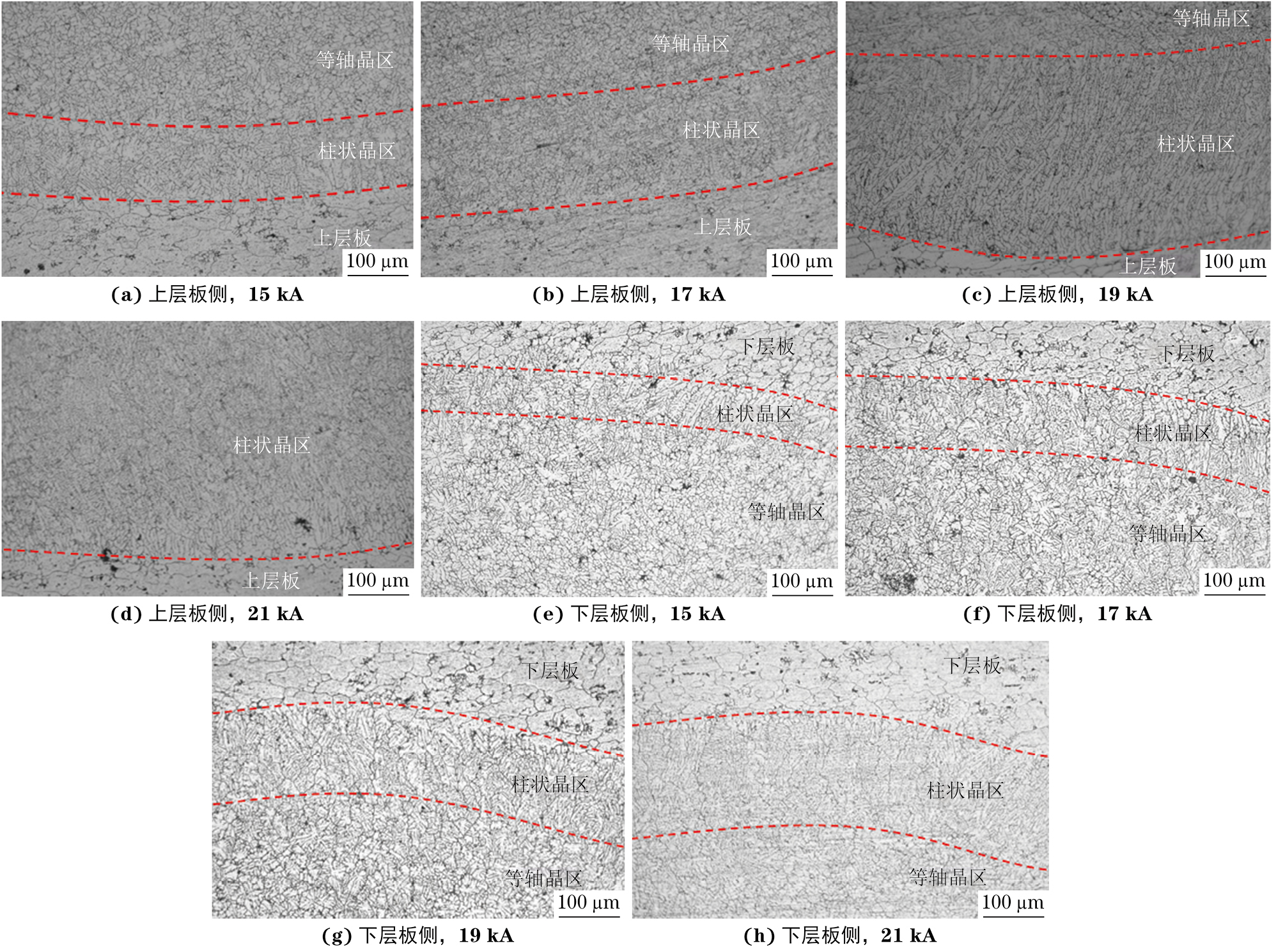由圖5可以看出,不同焊接電流下接頭焊核區(qū)與母材存在明顯的界面,晶粒垂直界面向焊核區(qū)內(nèi)部生長,形成一定寬度的柱狀晶區(qū),焊核的中心區(qū)域形成等軸晶。這是因為焊核區(qū)產(chǎn)熱量大并發(fā)生熔化,熱量從熔池區(qū)向未熔化母材方向傳遞并散失,晶粒在熔池與母材界面處形核,沿熱流反方向長大,從而在界面處形成柱狀晶區(qū);熔池中心則因成分過冷度增大而形成了等軸晶。隨著焊接電流的增大,柱狀晶區(qū)的寬度和晶粒尺寸增大,等軸晶區(qū)的寬度減??;晶粒發(fā)生粗化和焊核區(qū)的成分過冷區(qū)寬度減小是因為隨著焊接電流增大,熱輸入增大。與母材相比,焊核區(qū)的晶粒較為粗大,這是因為焊核區(qū)在點焊過程中經(jīng)歷了熔化凝固過程,并且冷卻速率相對較慢。下層板中柱狀晶區(qū)的寬度較窄,而由于電阻點焊時熱量從上、下電板點焊位置中心向外擴散的規(guī)律一致,上下層板焊核區(qū)的晶粒形態(tài)相似。