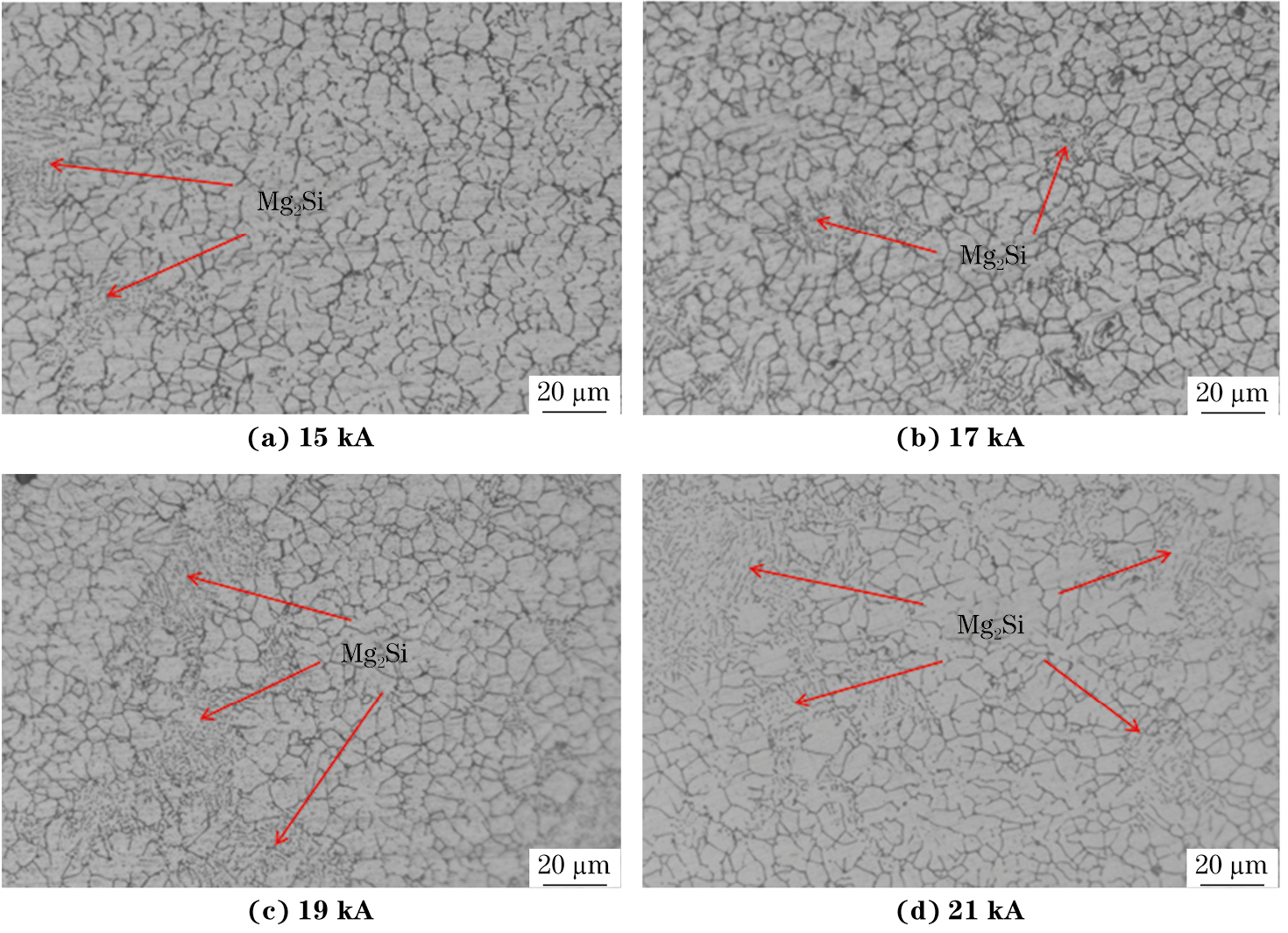 由圖6可以看出,當焊接電流較?。?5 kA)時,熔池溫度較低,其中心成分過冷度較大,形成了較多細小的花瓣狀等軸樹枝晶,晶界上分布著少量較小的第二相;隨著焊接電流增大,熔池溫度明顯升高,熔池中心成分過冷度減小,等軸狀樹枝晶顯著長大,晶粒尺寸增大,同時第二相發(fā)生粗化,數(shù)量顯著增多,并沿晶界分布更加明顯。6061鋁合金的合金元素為鎂和硅元素,推測第二相為Mg2Si強化相[13]。