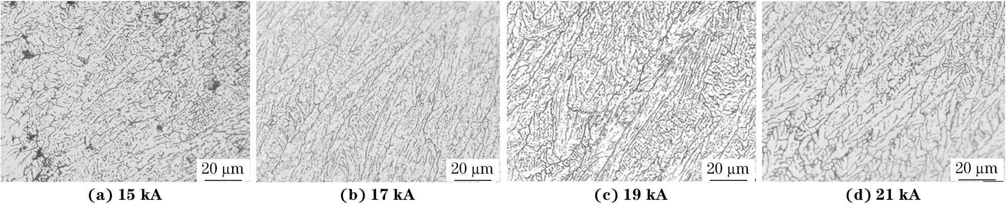 由圖7可以看出,不同焊接電流下接頭柱狀晶區(qū)的晶粒均沿溫度降低的方向生長,晶粒尺寸隨著焊接電流的增大而增大。這是因為焊接電流的增加顯著提高了熱輸入,使得熔池溫度升高,熔池冷卻速率減慢,晶粒生長時間延長,柱狀晶從溫度較低的母材向溫度較高的焊核方向長大。