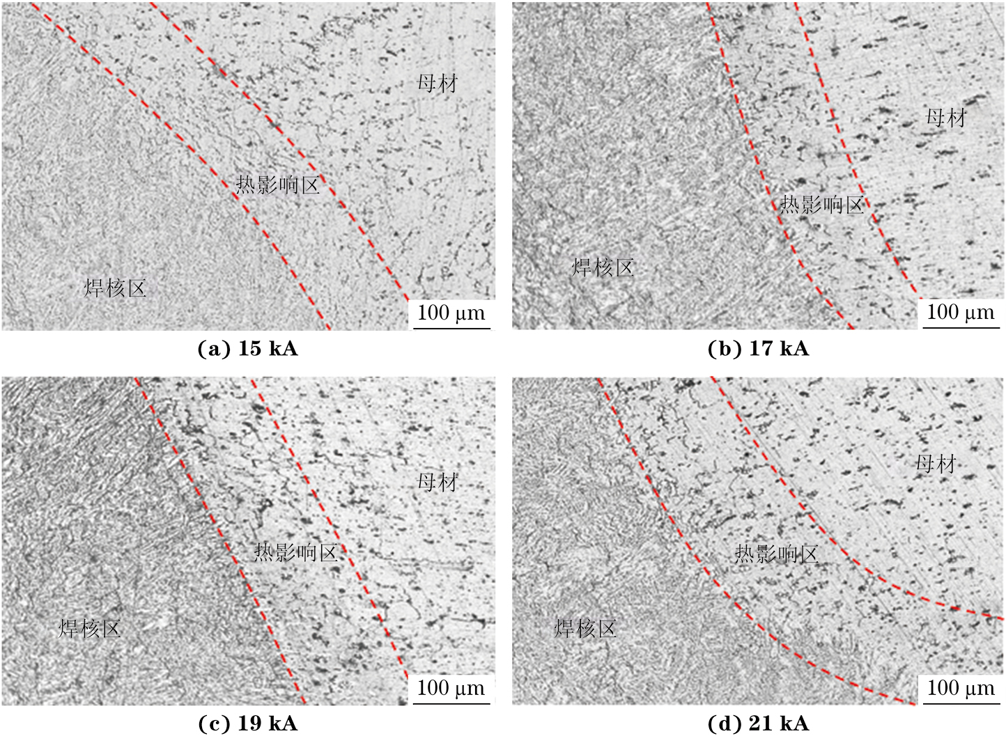 由圖8可以看出:熱影響區(qū)內(nèi)的晶粒相較于母材發(fā)生顯著粗化;隨著焊接電流增大,熱影響區(qū)晶粒尺寸增大,寬度增大,這是因為焊接電流增大使得熱影響區(qū)的最高溫度升高,高溫停留時間延長。這一試驗結果與文獻[14]中6061-T6鋁合金雙層板電阻點焊接頭熱影響區(qū)晶粒發(fā)生粗化的結果吻合。