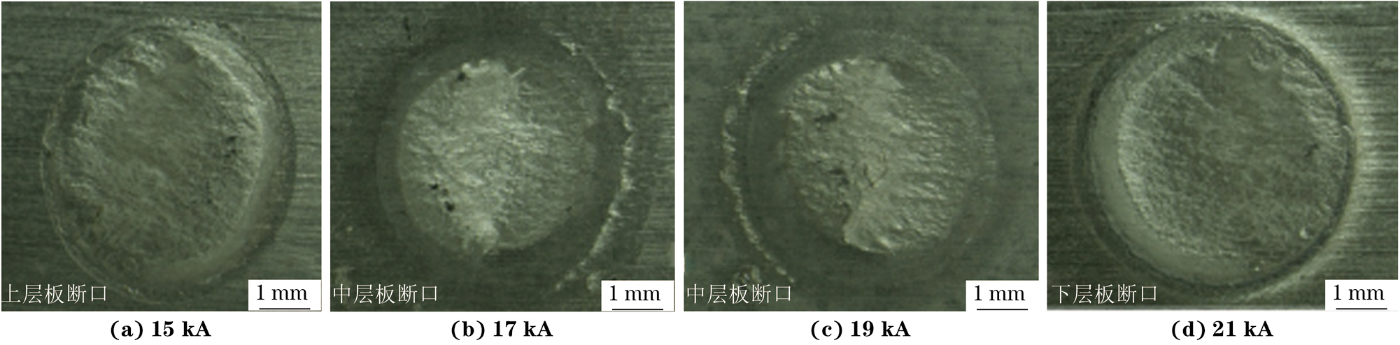 (2)不同焊接電流下接頭剪切斷裂方式均為紐扣斷裂。隨著焊接電流的增大,接頭剪切力先增大后減小,當焊接電流為19 kA時最大,為9.8 kN。