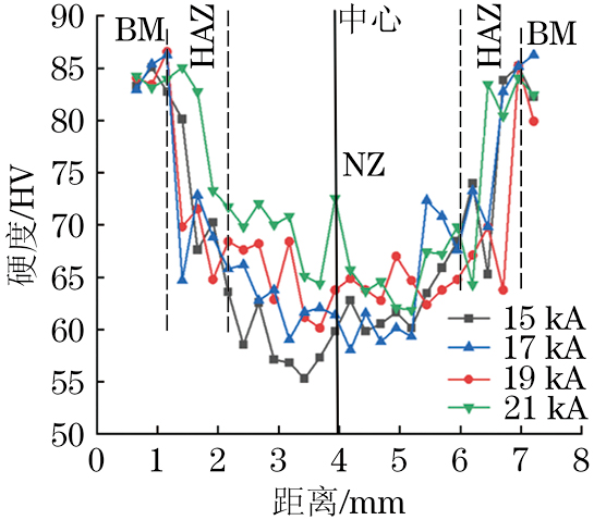 由圖10可以看出,不同焊接電流下接頭的硬度以焊縫為中心均呈左右對稱分布,母材(BM)硬度最高,熱影響區(qū)(HAZ)硬度次之,焊核區(qū)(NZ)硬度最低。在電阻點焊過程中,焊核區(qū)材料發(fā)生熔化,后凝固形成粗大的鑄造組織,因此硬度低于母材;熱影響區(qū)則受到焊接熱循環(huán)的作用,晶粒發(fā)生粗化,硬度降低。當焊接電流為15,17,19,21 kA時,接頭焊核區(qū)的最低硬度分別為55.8,57.6,60.8,62.7 HV??梢娮畹陀捕入S著焊接電流的增大而升高。焊核區(qū)的硬度分布不均勻,這種不均勻的現(xiàn)象在焊接電流較高時更為明顯,這是因為焊接電流的增加使得焊核區(qū)產(chǎn)生較多粗大的樹枝晶,同時第二相發(fā)生明顯粗化,導致部分區(qū)域硬度明顯低于其他區(qū)域,這與文獻[15]中6061-T6鋁合金雙層板電阻點焊接頭焊核區(qū)組織均為等軸晶,析出的Mg2Si相較少,硬度分布較為均勻的結果相符。