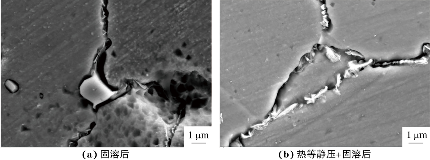 固溶后和熱等靜壓+固溶后試樣的沉積方向析出相的SEM形貌及能譜分析結(jié)果如圖8,9所示。由圖8可知:經(jīng)過固溶處理合金的析出相主要沿晶界連續(xù)分布,少量存在于晶內(nèi);而熱等靜壓+固溶后合金內(nèi)的析出相為沿晶界析出尺寸較小的相。在熱等靜壓處理后,合金的成分逐漸均勻化,由于冷卻時(shí)降溫速率較慢,在晶界,合金元素Cr、Mo等有充足的時(shí)間偏聚形成富鉻的M23C6和M6C碳化物[5]。再固溶后,大部分在熱等靜壓過程中析出的碳化物回溶進(jìn)基體,因此熱等靜壓+固溶后合金的碳化物主要分布在晶界位置,并且其尺寸較小[6]。