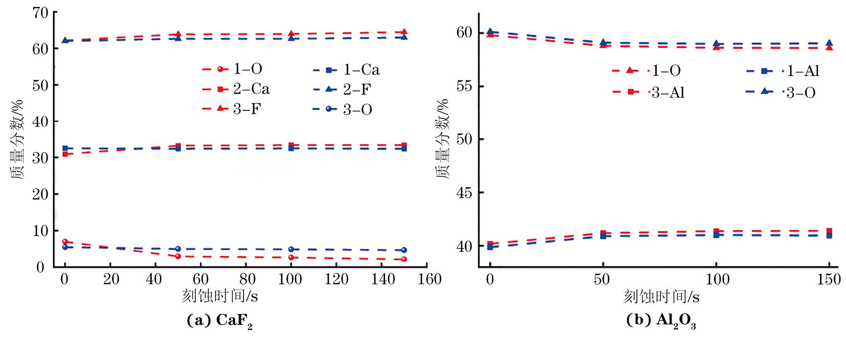 (1)深度剖析測試CaF2試樣過程中,真空腔中的殘余氣體吸附到試樣表面,形成羥基和吸附O2,導(dǎo)致測量結(jié)果中氧元素含量偏高。