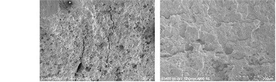 35鋼螺栓斷口有明顯的疲勞弧線與疲勞條帶,斷口掃描電鏡形貌見圖9-24。